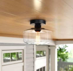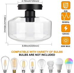 This 120V semi-flush ceiling light features a clear 8.66″ glass shade paired with a black matte metal base, blending antique charm with a modern edge. The compact 7.09″ height and 4.72″ canopy make it a stylish and space-saving option for any room.