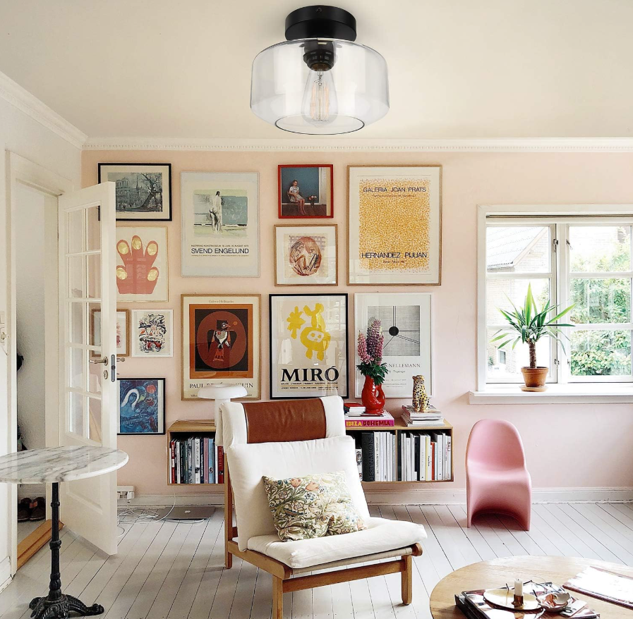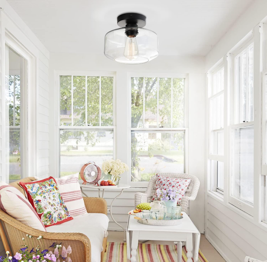 With its elegant glass shade and vintage-inspired metal base, this farmhouse-style ceiling lamp enhances a wide range of spaces: hallways, foyers, porches, mudrooms, stairways, kitchens, closets, bedrooms, dining rooms, and living rooms. It’s also an excellent choice for commercial settings like cafés, bars, hotels, and restaurants.