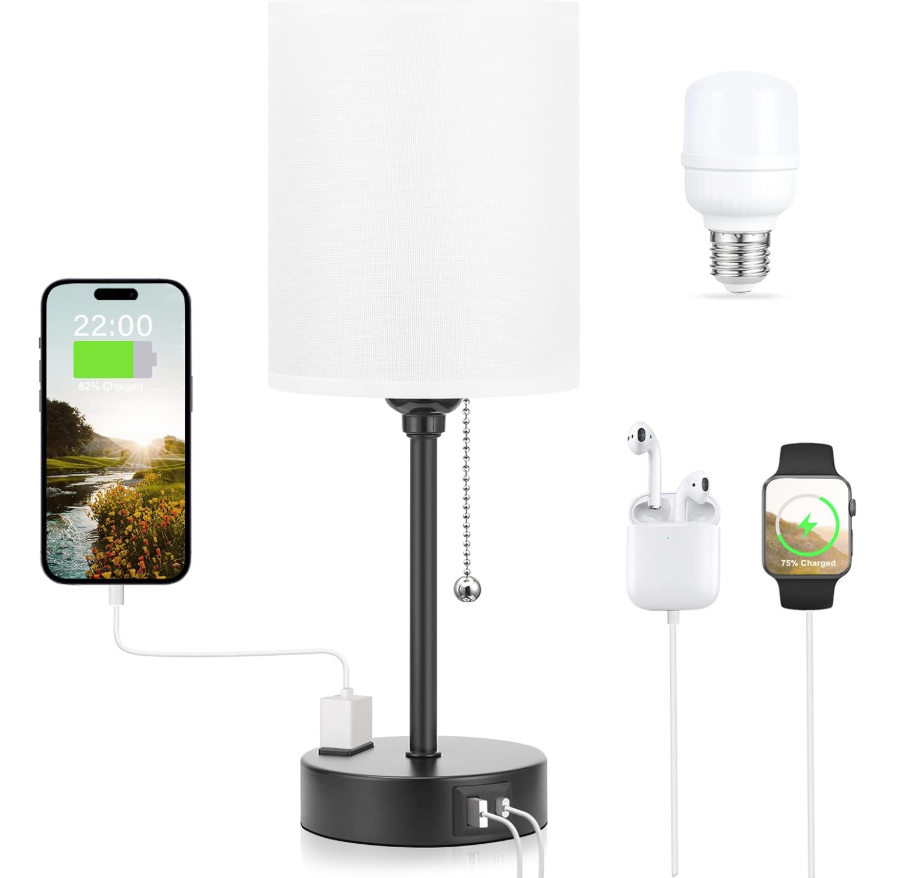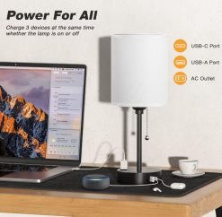 Designed for functionality, this nightstand lamp includes a USB-C port, a USB port, and a 2-prong AC outlet, all delivering a stable 5V/2.1A output. Easily charge your phone, tablet, Kindle, smartwatch, humidifier, or other devices—whether the lamp is turned on or off—saving both space and time.